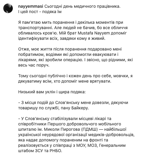 В день медика он решил в своем Instagram поблагодарить медиков, водителей, побратимов и всех остальных, кто спас ему жизнь после ранения.