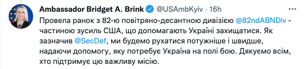 "Провела утро с 82-й воздушно-десантной бригадой, частью США, которая пытается помочь Украине защитить себя. Как сказал Ллойд Остин, мы полны решимости прилагать больше усилий и двигаться быстрее, чтобы предоставить помощь, в которой нуждается Украина на поле боя. Спасибо всем за поддержку этой важной миссии", - пишет Бринк.