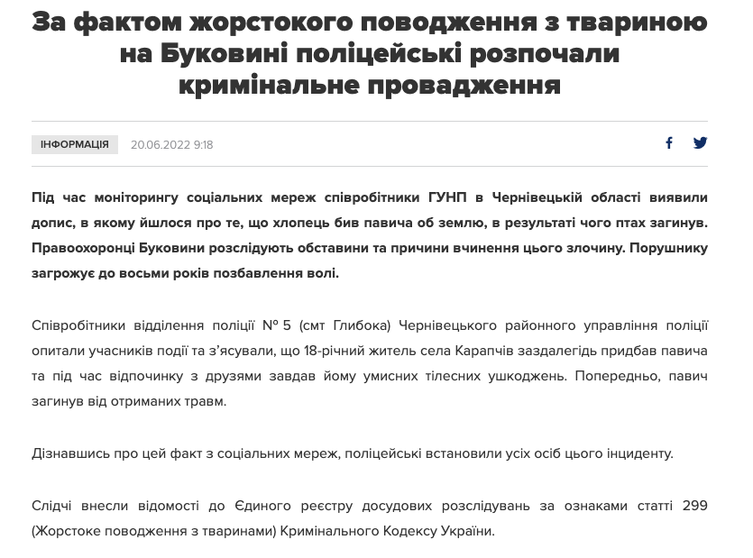 Следователи внесли сведения в Единый реестр досудебных расследований по признакам статьи 299 (Жестокое обращение с животными) Уголовного Кодекса Украины.