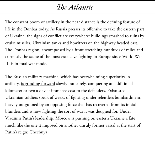 "Русская военная машина, обладающая подавляющим превосходством в артиллерии, медленно, но верно продвигается вперед, отвоевывая в день дополнительный километр или два ценой огромных потерь для обороняющихся", - описывает текущее положение дел в Украине автор.