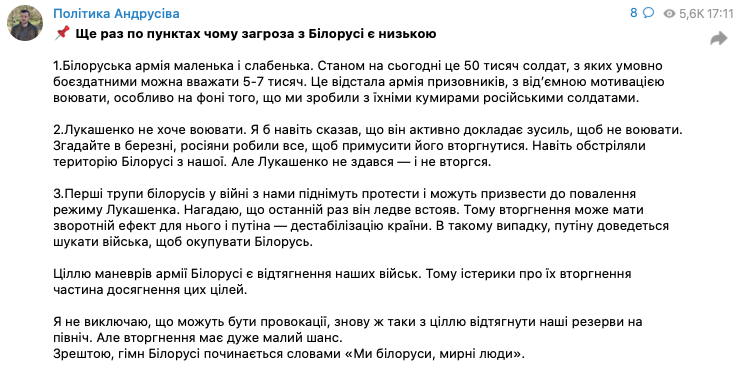 Он считает, что истинной целью маневров армии Беларуси возле границы с Украиной является отвлечение наших войск. При этом Андрусив допускает провокации на границе, но не вторжение.