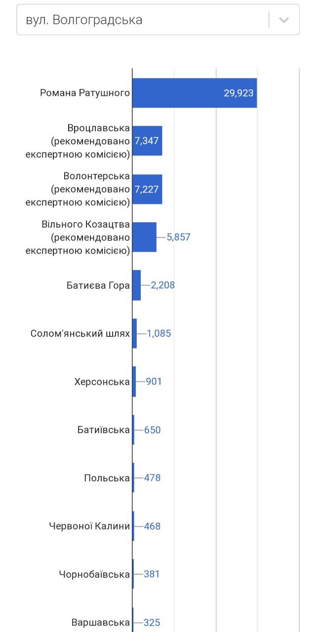 Улицу Волгоградскую - в честь погибшего на войне 24-летнего активиста Романа Ратушного. За вариант с Ратушным отдали рекордное количество голосов - почти 30 тысяч. Это самый высокий показатель в голосовании за дерусификацию киевских топонимов. Причем этот вариант не был в списке рекомендованных комиссией.
