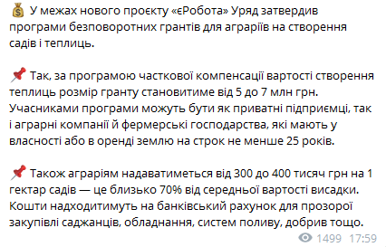 "Мы планируем выдать 20 тысяч таких грантов в год. Соответственно, бюджет программы в год – 5 млрд грн. Мы говорим о возможности запустить любой микробизнес, такой, как пошив одежды и обуви, химчистка, сервисный или ремонтный центр, СТО, монтажные работы и тому подобное", – рассказал Шмигаль.