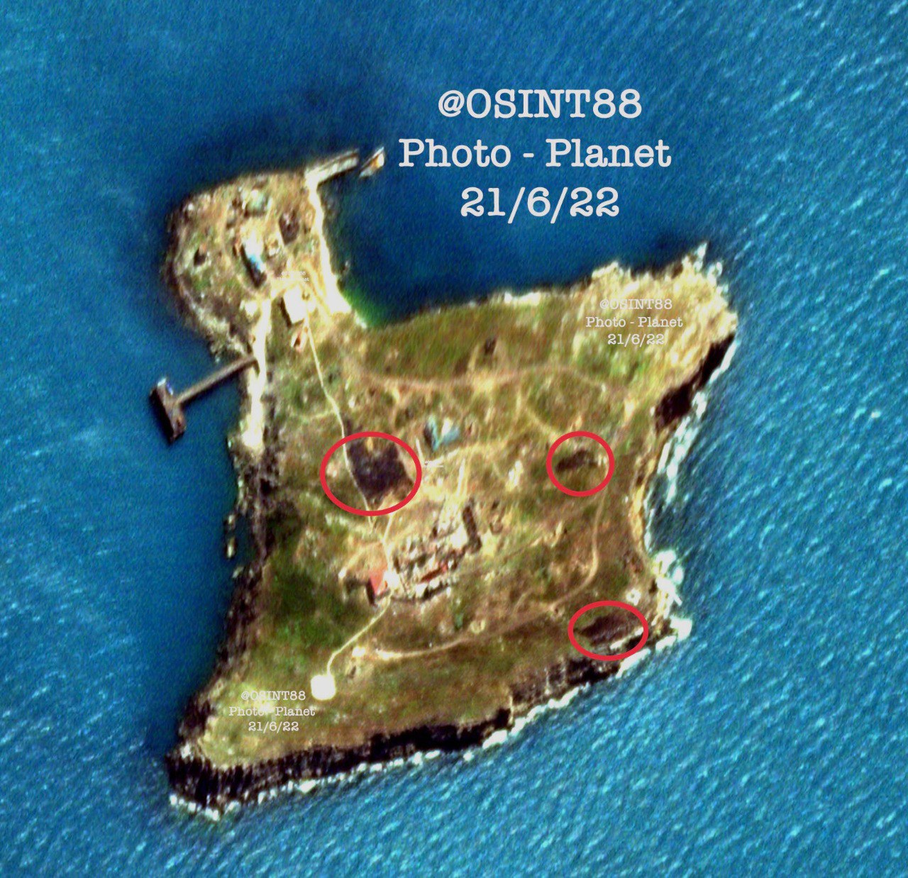 Спутниковые снимки Planet Labs, на которых демонстрируются результаты вчерашнего обстрела острова Змеиный украинской армией.