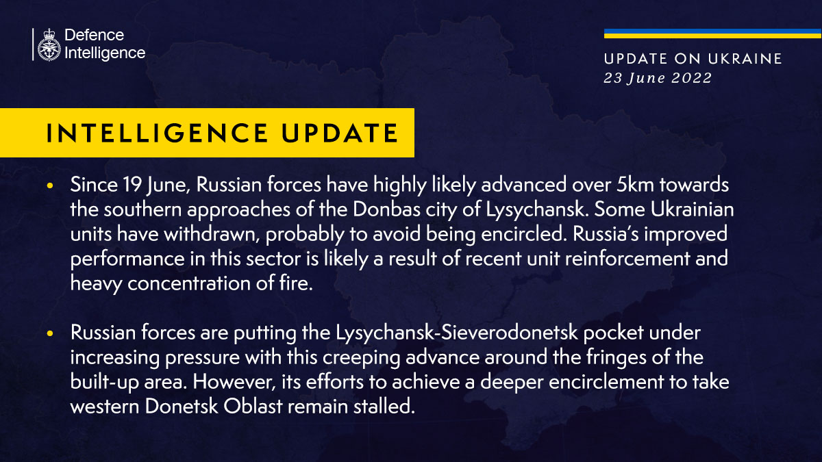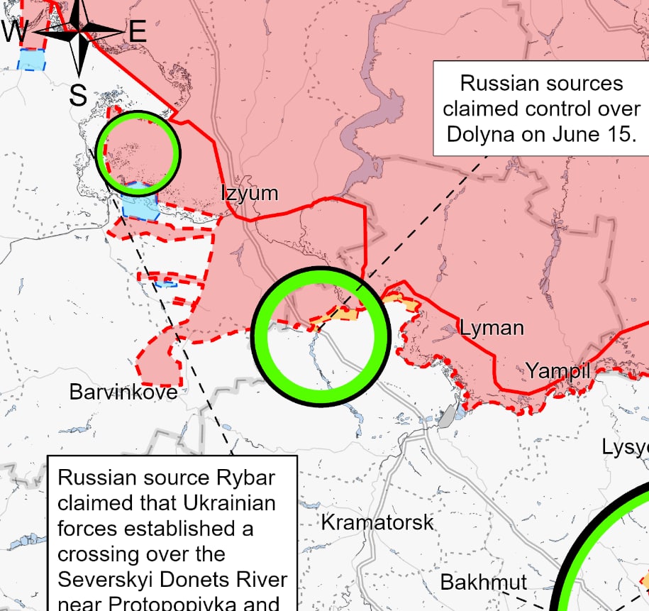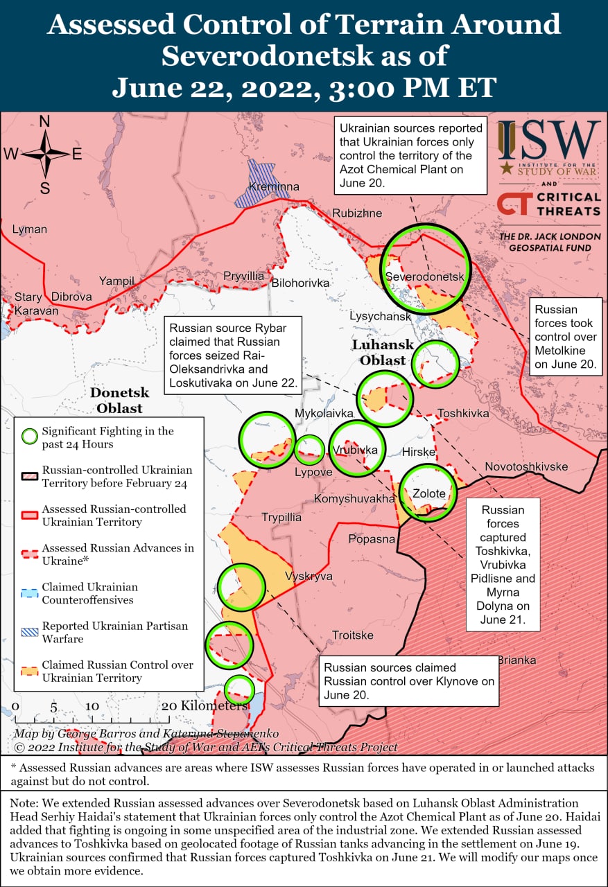 - С 19 июня российские силы, скорее всего, продвинулись более чем на 5 км к южным подступам Лисичанска.