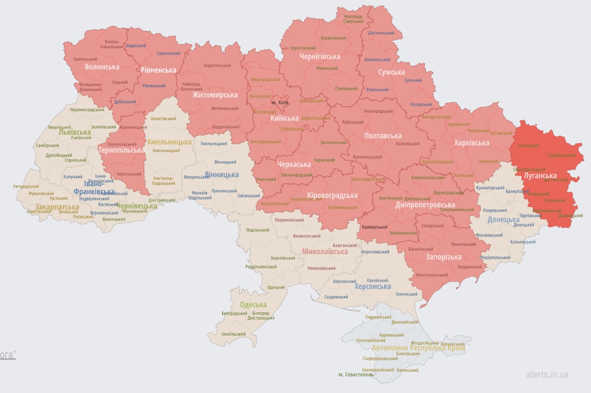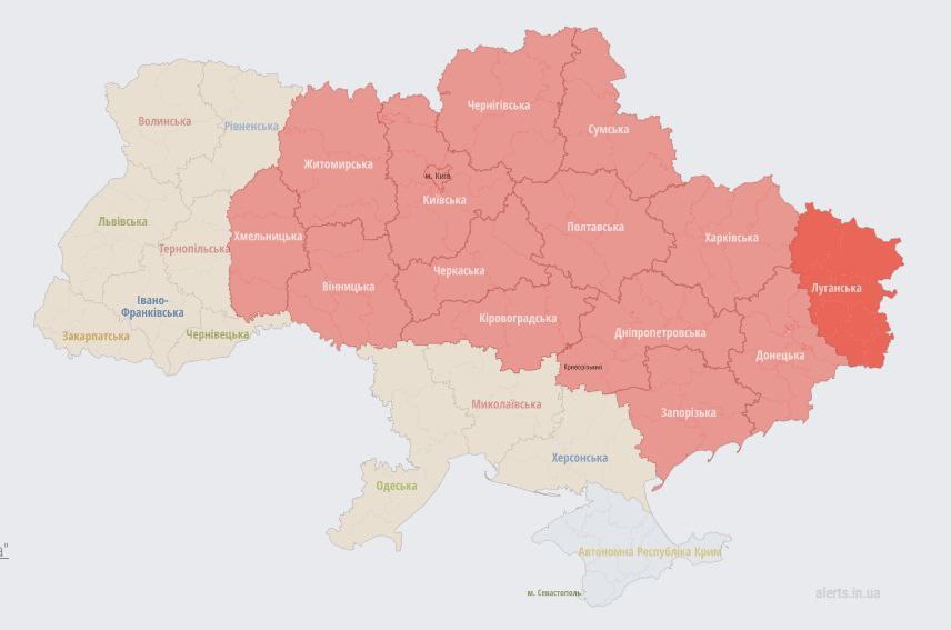 09:00 Большая часть областей Украины в зоне воздушной тревоги - включая Киев.