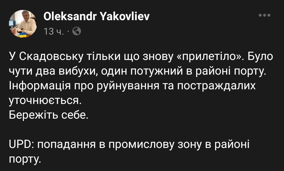 Скадовск Херсонской области оккупирован Россией. То есть, видимо, речь о прилете со стороны ВСУ.