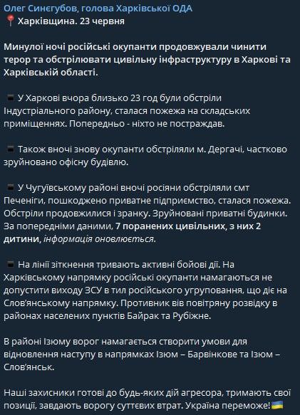 При этом он заявил, что эвакуация и доставка гуманитарных грузов в Лисичанск продолжается, а войска "продолжают сдерживать россиян в Северодонецке и Сиротино", и "отбивают атаки на Золотое и Волчеяровку".