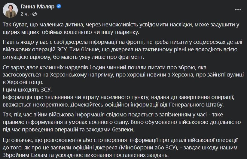 Замминистра обороны Анна Маляр призвала не распространять неподтвержденную информацию, так как она вредит ВСУ.