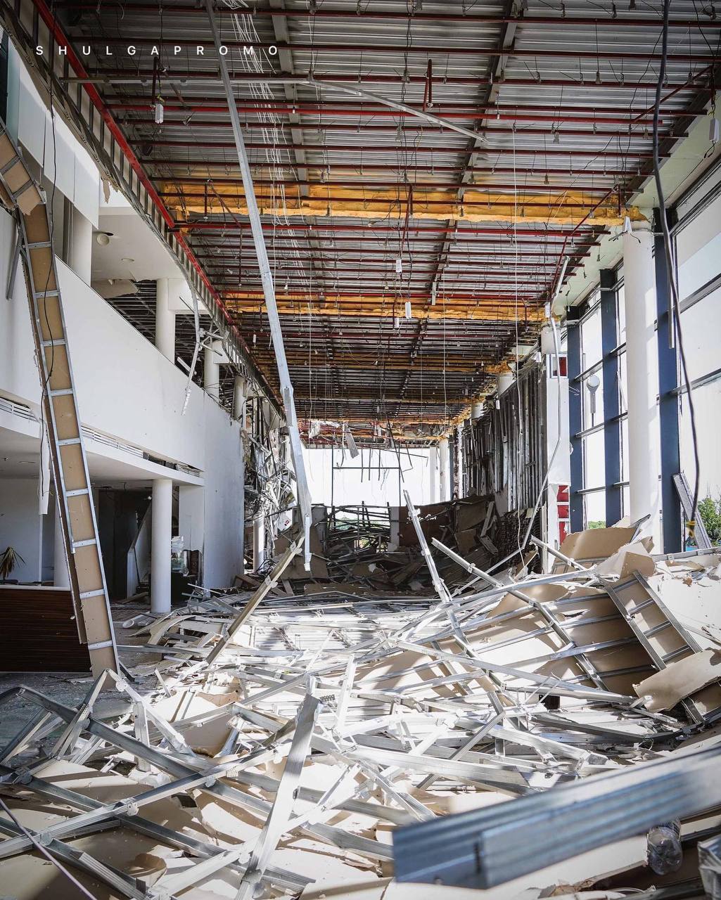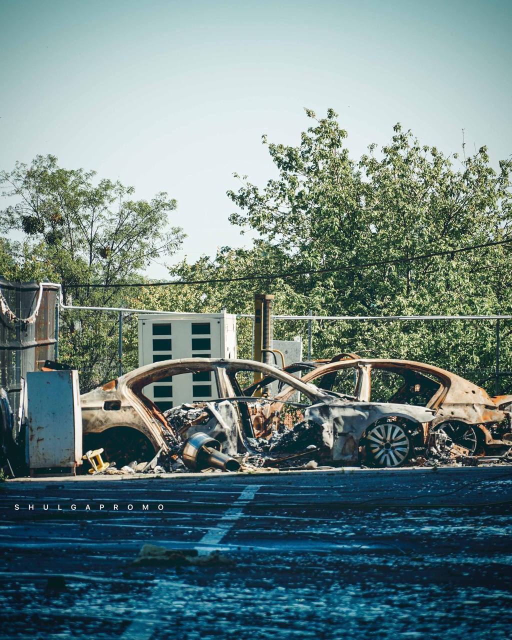 На протяжении квартала вдоль дороги - разрушенные остановки, выбитые стекла, воронки на земле.