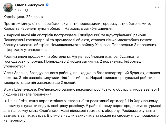 Об этом сообщил глава Харьковской ОВА Олег Синегубов.