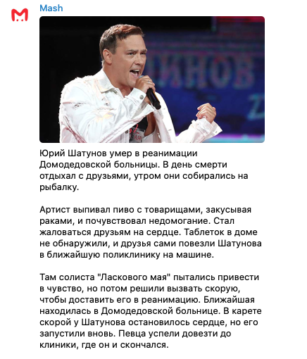 Также в сети публикуют видео с одного из последних выступлений Шатунова, где он заявляет: "Не люблю, когда цветы кладут к ногам. Я ж не памятник. Пока ещё"