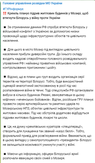 "Известно, что в планы этих групп входит организация серии терактов на территории Беларуси. То есть, будет использован сценарий аналогичный примененному в России во время разжигания войны в Чечне. Тогда спецслужбы РФ организовали взрывы в нескольких домах Рязани, обвинив в этом мифических "чеченских боевиков". Следовательно, российское ГРУ планирует провести серию артиллерийских и ракетных ударов по Мозырскому НПЗ, объектам гражданской инфраструктуры и жилым массивам. При обстреле дополнительно произойдут подрывы жилых домов, больницы и школы", - говоритмся в сообщении ГУР.