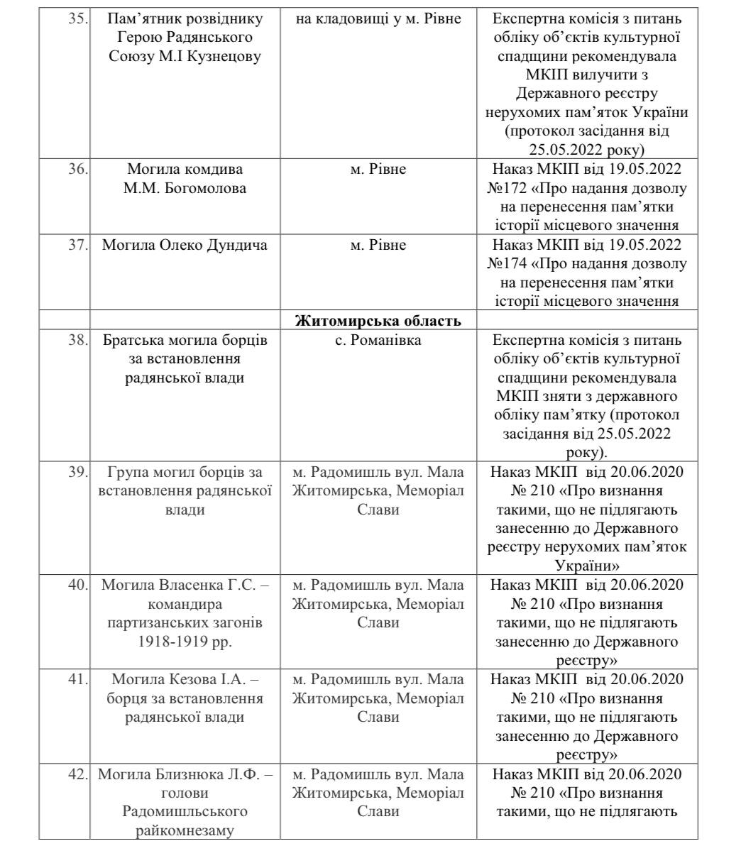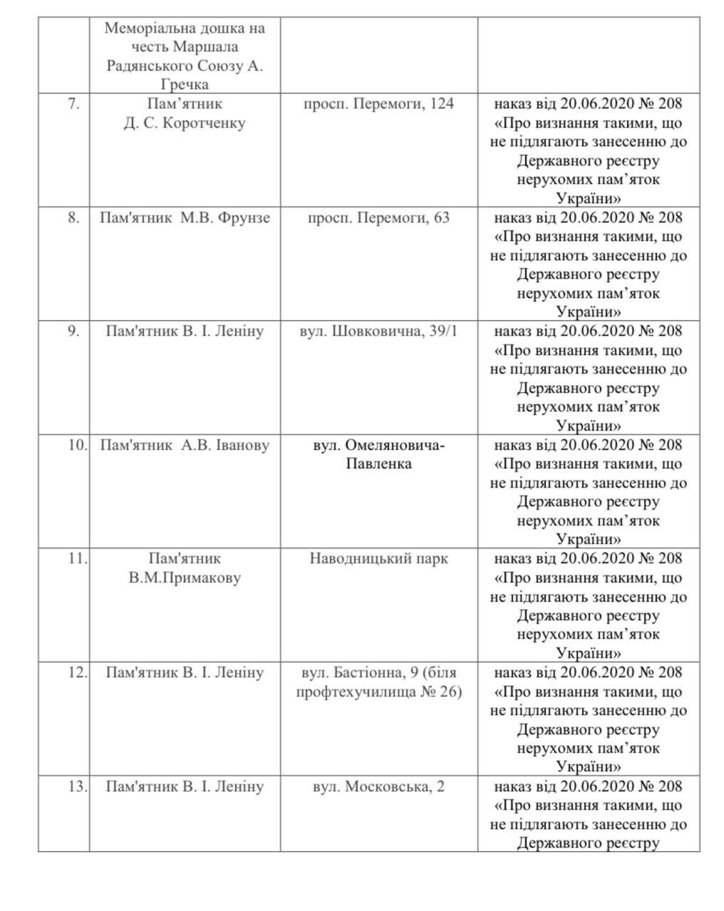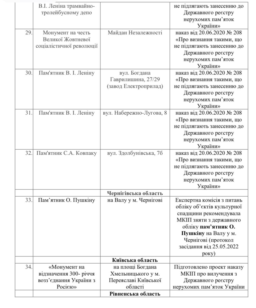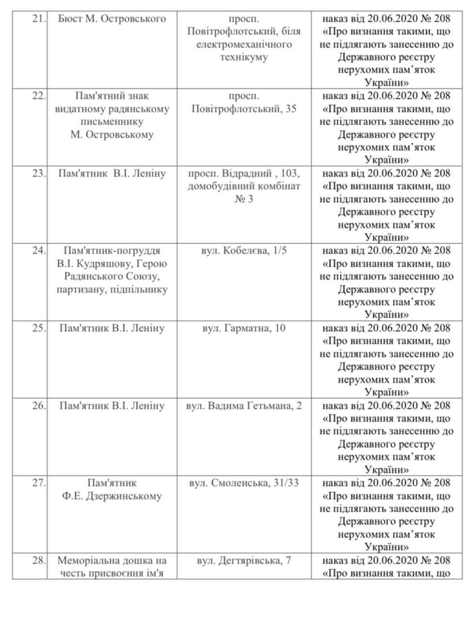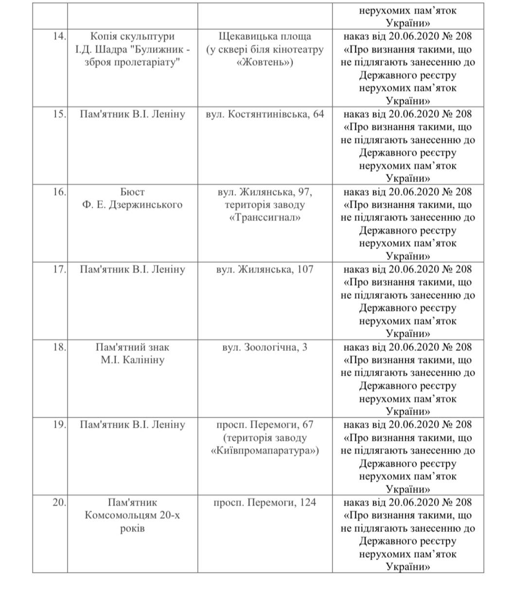 Львиную долю списка составляют памятники Ленину - их в Киеве до сих пор уцелело 11 штук. Кроме того, дважды упоминается глава ЧК Феликс Дзержинский и писатель Николай Островский. Есть в списке и такой объект, как копия известного памятника "Булыжник - оружие пролетариата".