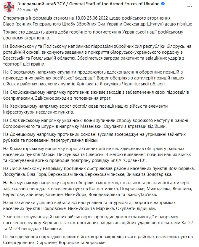 2. Генштаб официально признал, что ВСУ отошли из Северодонецка и его пригородов - Сиротино, Вороново и Боровское.
