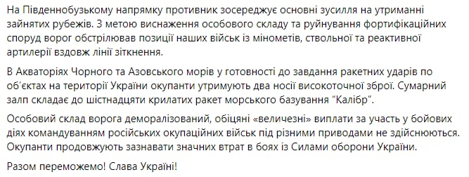 7. На границе Херсонской и Днепропетровской областей противник вел контрнаступление в районе сел Потемкино и Высокополье, но отошел назад.