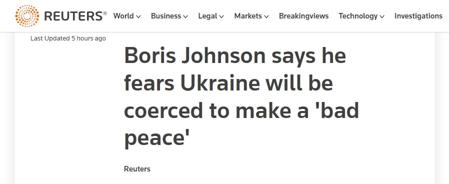 20:23 Премьер-министр Великобритании Борис Джонсон опасается, что Украину принудят к заключению "плохого мира" с РФ, пишет Reuters.
