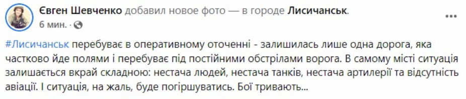 По неофициальным данным с украинской стороны, Лисичанск уже находится в оперативном окружении. Оттуда осталась только одна дорога, которая частично идет по полям и находится под постоянными обстрелами.