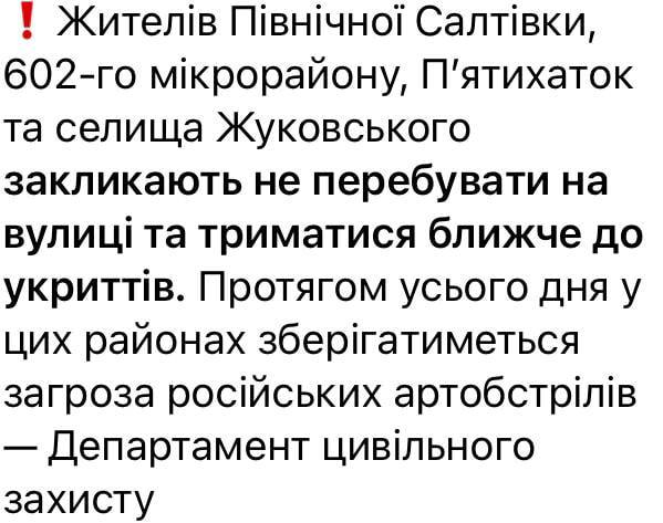 "Жителей Северной Салтовки, 602-го микрорайона, Пятихаток и поселка Жуковского призывают не находиться на улице и держаться ближе к укрытиям. В течение всего дня в этих районах будет сохраняться угроза российских артобстрелов", - говорится в сообщении.