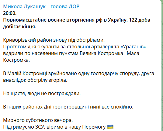 Об этом в своем Телеграм-канале сообщил глава Днепропетровского областного совета Николай Лукашук.