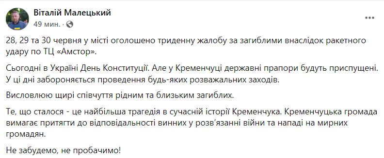 28-30 июня в Кременчуге объявлен трехдневный траур по погибшим в результате ракетного удара по ТРЦ "Амстор".