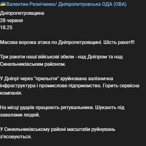 Во вторник, 28 июня, российские войска обстреляли Днепр и Днепропетровскую область. Вражеская ракета попала в СТО.