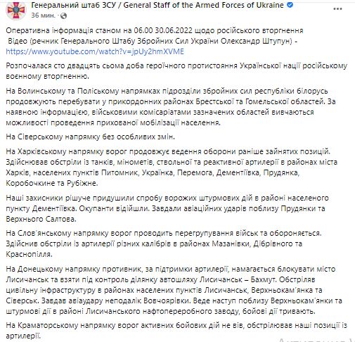 Утром 30 июня Генштаб Вооруженных сил Украины обнародовал сводку о ситуации на фронте.