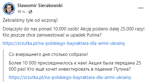 "К нам присоединились более 10 тысяч человек. Информацию об акции распространили 25 тысяч раз. Кто еще хочет инвестировать в поражение Путина?" – написал Сераковский ночью 30 июня.