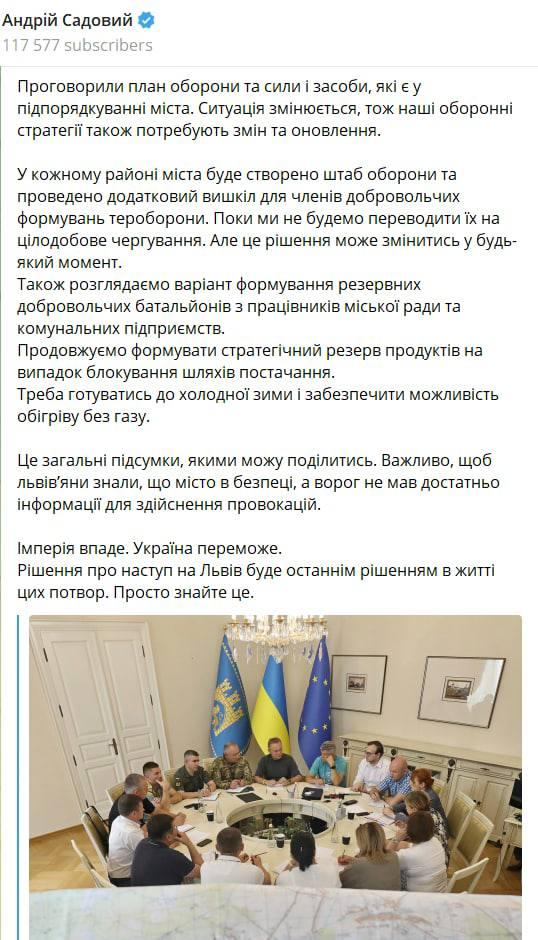"В каждом районе города будет создан штаб обороны и проведена дополнительная подготовка для членов добровольческих формирований терробороны. Пока мы не будем переводить их на круглосуточное дежурство. Но это решение может измениться в любой момент. Также рассматриваем вариант формирования резервных добровольческих батальонов из работников городского совета и коммунальных предприятий", - пишет Садовой.
