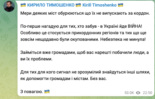 "Мэры некоторых городов возмущаются, что их не выпускают за границу. Во-первых напоминаю для тех, кто забыл – в Украине идет ВОЙНА! Займитесь уже общинами, чтобы вас наконец-то увидели люди, а вы их проблемы. Для тех для кого сигнал не ясен найдутся другие пути, как помочь общинам и городам. Без вас", - написал Тимошенко.