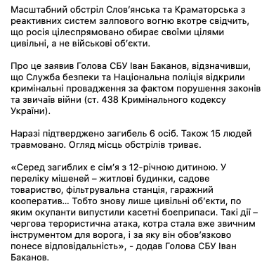 Среди погибших - семья с 12-летним ребенком, сообщил глава СБУ Иван Баканов, назвав обстрел Славянска и Краматорска - "очередной террористической атакой, ставшей уже привычным инструментом для врага".