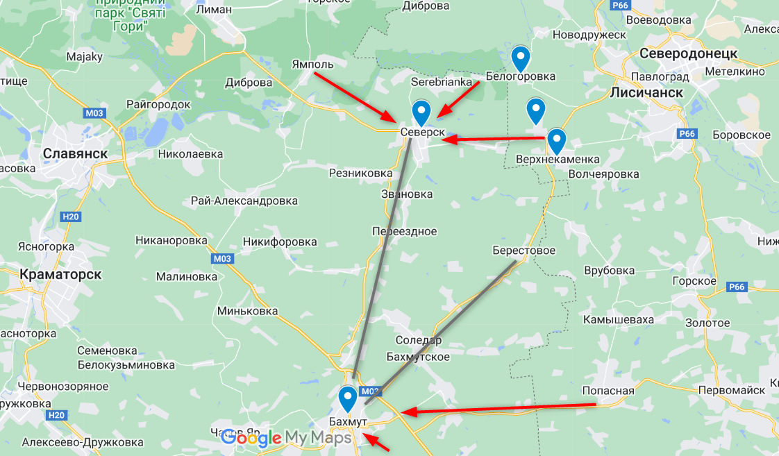 А с учетом вчерашнего захвата Верхнекаменки, которая контролирует дорогу на Бахмут, все пути из Лисичанска, как писалось выше, судя по всему, уже перерезаны.