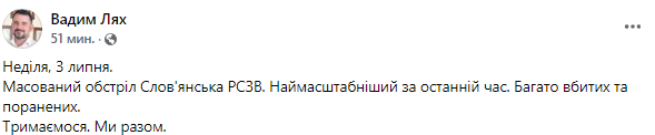 Кроме того, в Славянске за 1 июля погибли четыре мирных жителя, семеро получили ранения в результате вражеского обстрела города. Под обстрел попали микрорайон Лиманы, улицы Барвенковская, Подгорная, Данилевского. Славянск обстреляли кассетными снарядами.