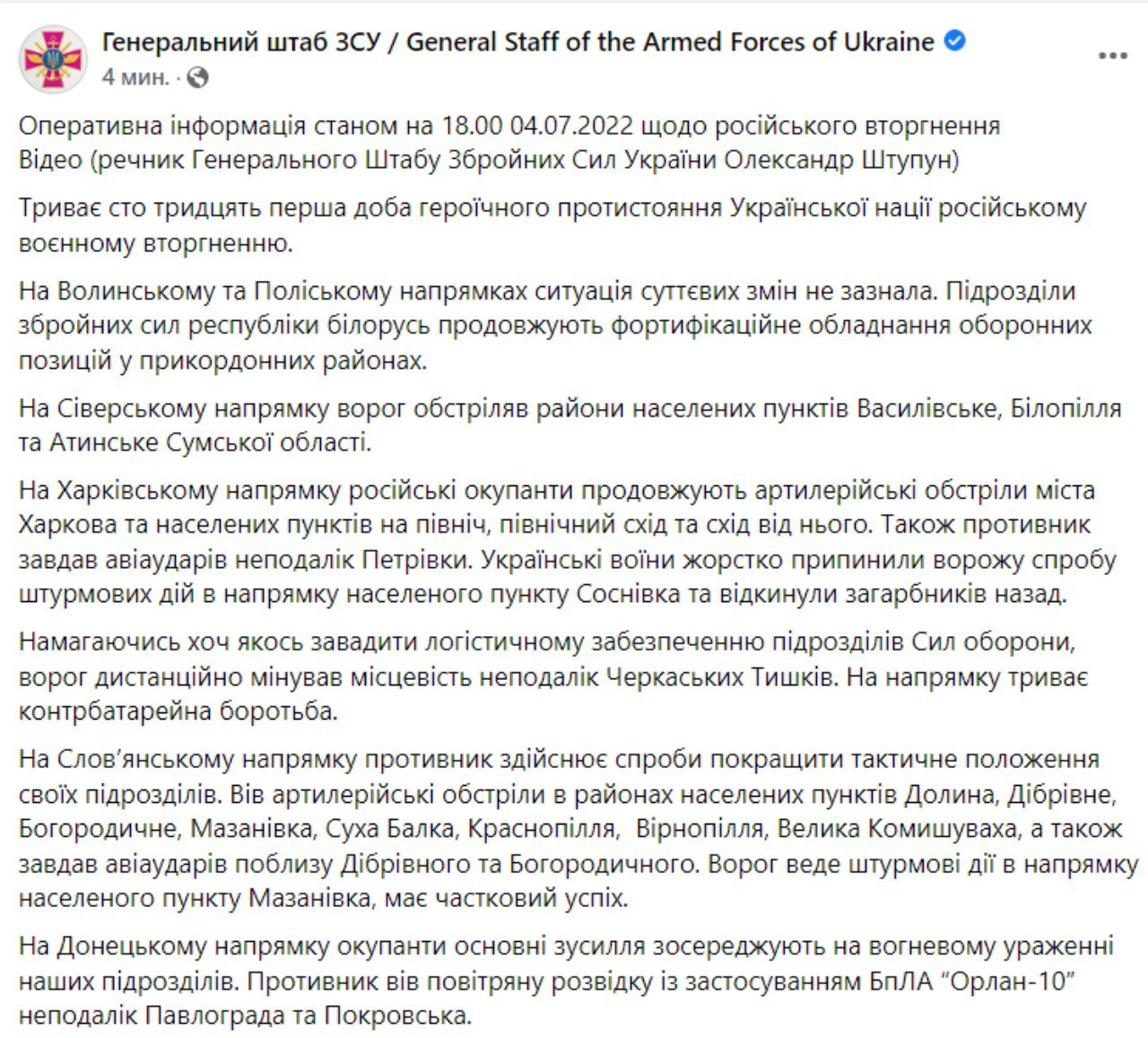 В понедельник, 4 июля, в Украине уже 131-й день продолжается война с Россией.
