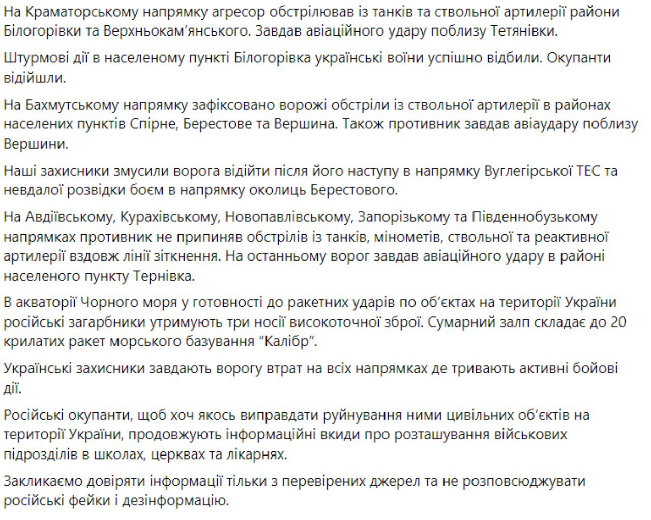 4. "Ситуация на фронтах за сутки не изменилась. Противник продолжает терроризировать пограничные районы Сумской области, Харьков и района области, Донбасс. ВСУ отвечают, уничтожая их военный потенциал. Нам нужно переломить их".