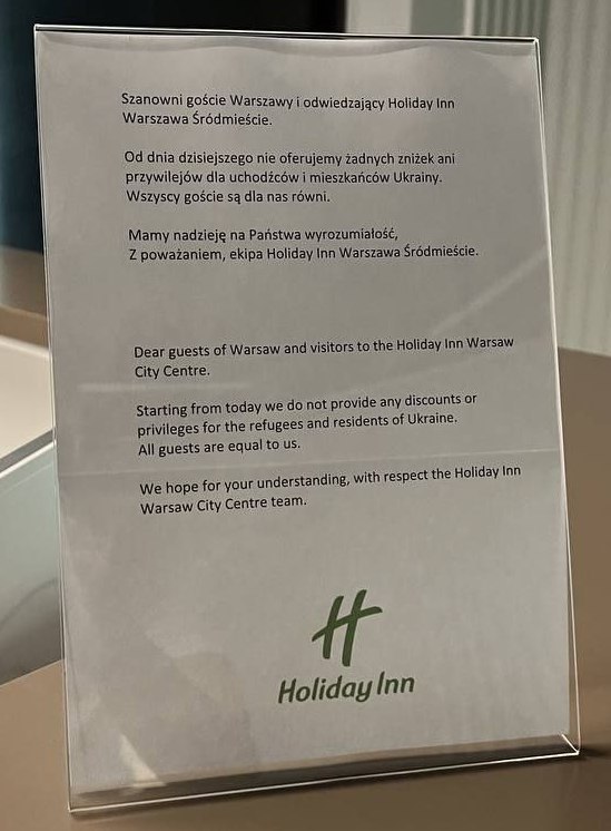 21.47 Фото объявления из польской гостиницы о том, что скидки для беженцев и украинцев больше не будут предоставляться, так как для отельеров все посетители равны между собой.