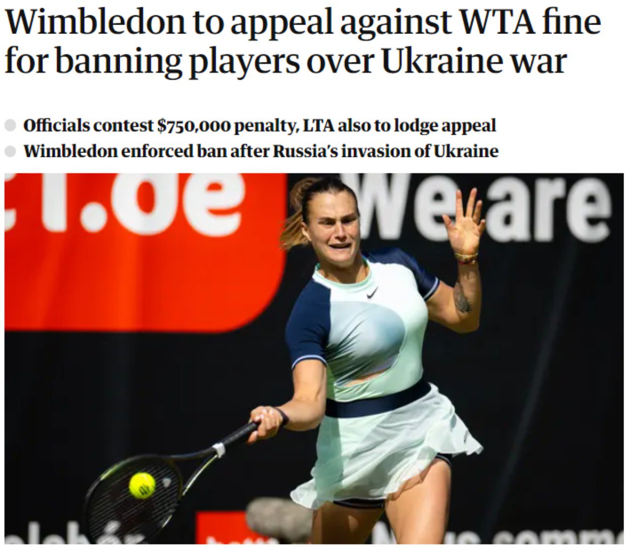 Салли Болтон, исполнительный директор Всеанглийского теннисного клуба, подтвердила в понедельник, что Уимблдон начал апелляционное производство по поводу штрафа в размере 750 000 долларов.