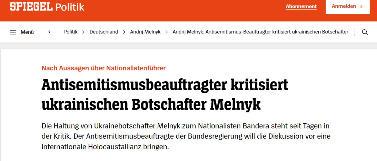 Уполномоченный правительства Германии по борьбе с антисемитизмом Феликс Кляйн резко раскритиковал посла и предложил обсудить "дело Мельника" с международным альянсом Холокоста.