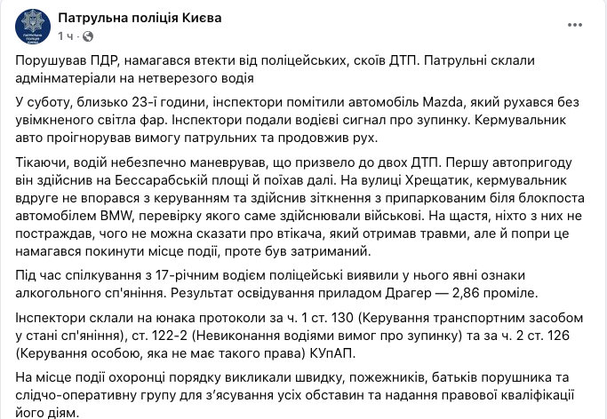 В центре Киева пьяный 17-летний водитель, пытаясь скрыться от полицейских после нарушения ПДД, дважды врезался в другие авто.