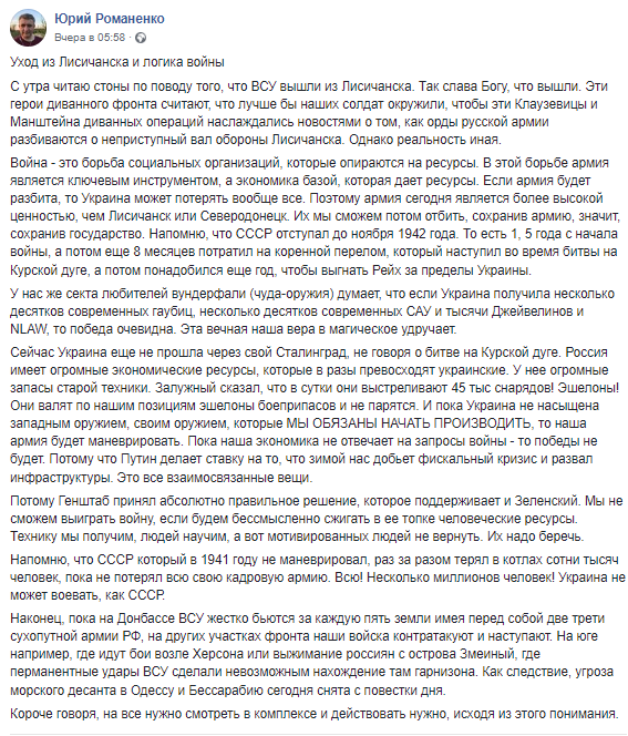 Впрочем, многие пишут, что решение отступить из Лисичанска было обоснованным. Политолог Юрий Романенко пишет о том, что армию надо беречь и боеспособность ВСУ важнее конкретных городов.
