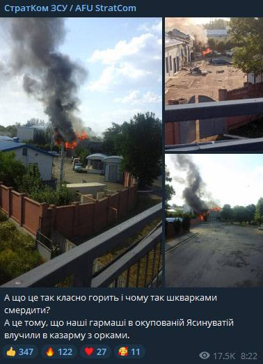 Управление стратегических коммуникаций ВСУ сегодня заявило, что нанесен удар по казарме противника в Ясиноватой в "ДНР". Отметим, что это один из немногих случаев, когда украинские военные официально подтверждают обстрел городов на неподконтрольных территориях.