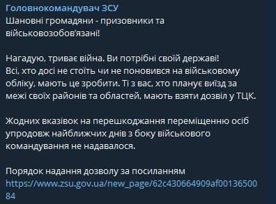 Те, кто планирует выезд за пределы своих районов и областей, должны взять разрешение в ТЦК", - написал Залужный.