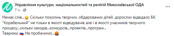 "Сколько поколений творческих, одаренных детей, взрослых посетило БК "Корабельный" не только в качестве посетителей, но и в качестве участников творческого процесса... сколько мероприятий...конкурсов...проектов...программ...Твари! Не простим...", — прокомментировали в управлении.
