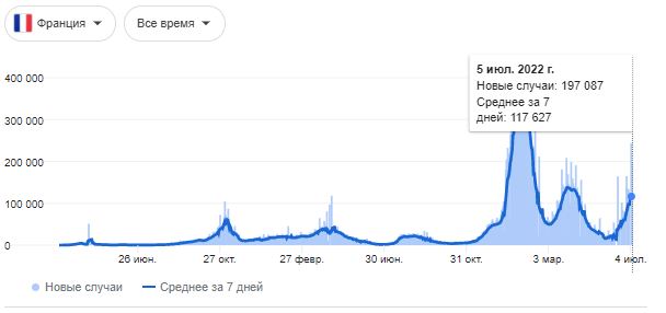 Во Франции на начало июля среднее число ежедневных подтвержденных случаев заражения ковидом приближается к 200 тысячам случаев. Заметен рост по сравнению с данными июня.