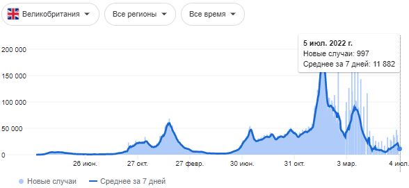 В Великобритании на 1 июля заболевших было около 2,3 млн, то есть каждый тридцатый житель страны. Это на 32% больше, чем всего неделю до этого.