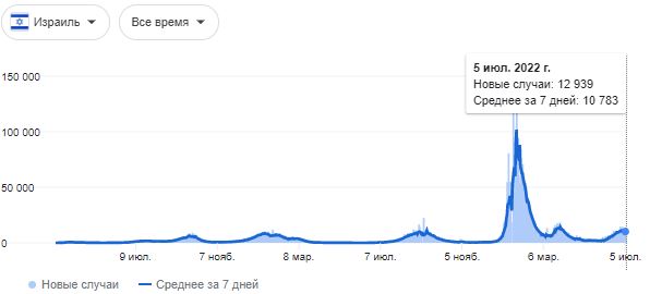 В Израиле о начале седьмой волны коронавируса объявили еще в середине июня. Тогда Covid-19 в стране зафиксировали у почти 47 тысяч человек, при том, что в стране полностью вакцинировано 66% населения.