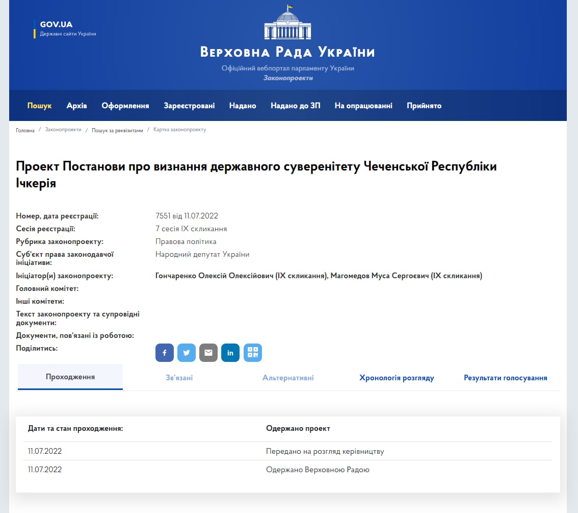 На сайте Верховной Рады появился законопроект о признании независимости "Чеченской республики Ичкерия".
