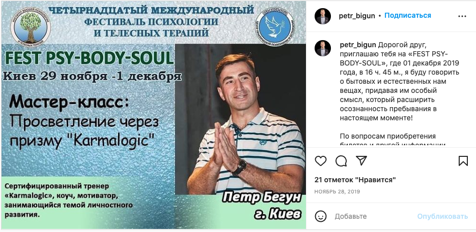 А в своем Instagram он приглашал людей на семинары, где обещал "говорить о бытовых и естественных нам вещах, придавая им особый смысл, который расширит осознанность пребывания в настоящем моменте!".