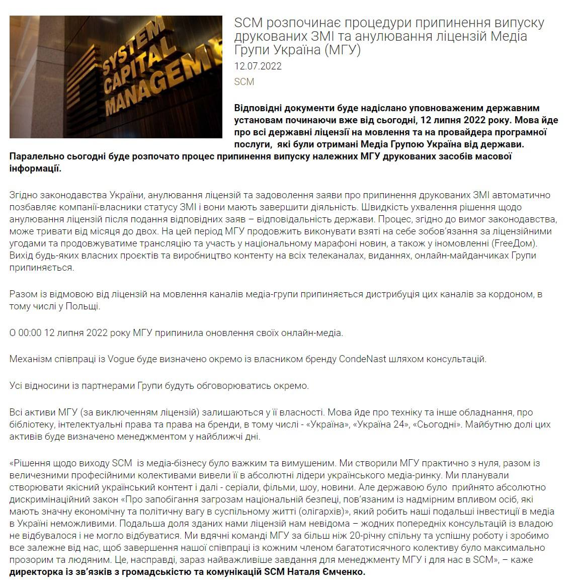 Директор по связям с общественностью SCM Наталья Емченко заявила, что причина данного решения - закон об олигархах, который она назвала "абсолютно дискриминационным".