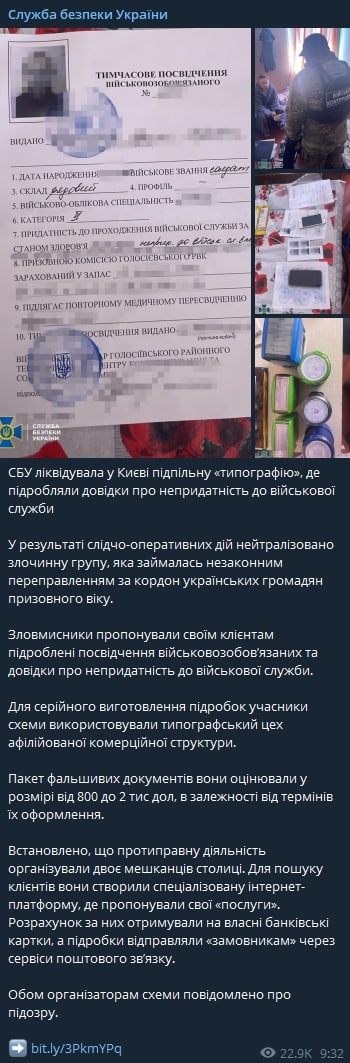В Киеве подпольная типография печатала липовые справки о воинской непригодности и продавала их в сети